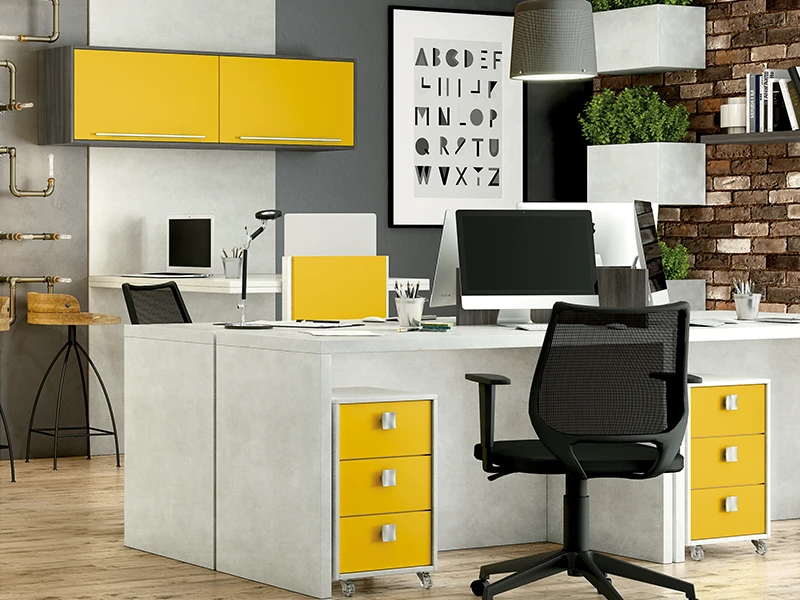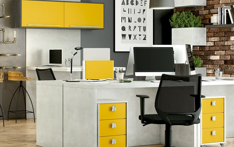- Já pense em soluções como: espaço para esconder um multifuncional em um gavetão, trilhos para pastas de arquivo, canaleta para esconder tomadas e cabos, etc.